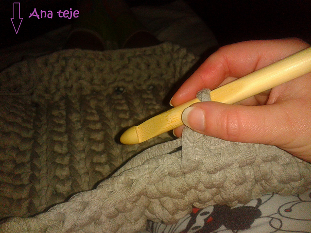 Y tenía el antojo de que la cesta tenía que ser de trapillo. Así que mi primera labor exclusivamente a ganchillo ha sido a lo grande, con el " anzuelo" como lo llama Germán ;-) ( anzuelo noooo, comenta el aludido por Facebook, "arpón, es un arpón" ) jajaajjaajajjaja